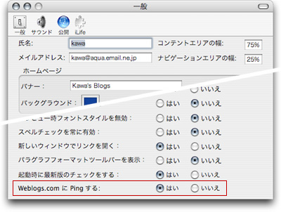 iBlogユーザーの方はぜひ、「環境設定→一般」の一番下にある「Weblogs.comにPingする」を「はい」にチェック入れておいてください。