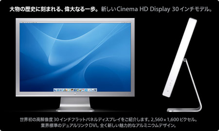 事前にいろいろなサイトでウワサされていたモノとはデザインこそ違いますが20・23・30インチのラインナップでアルミ製というのはG5やPowerBookのモニタとして似合いますよね。