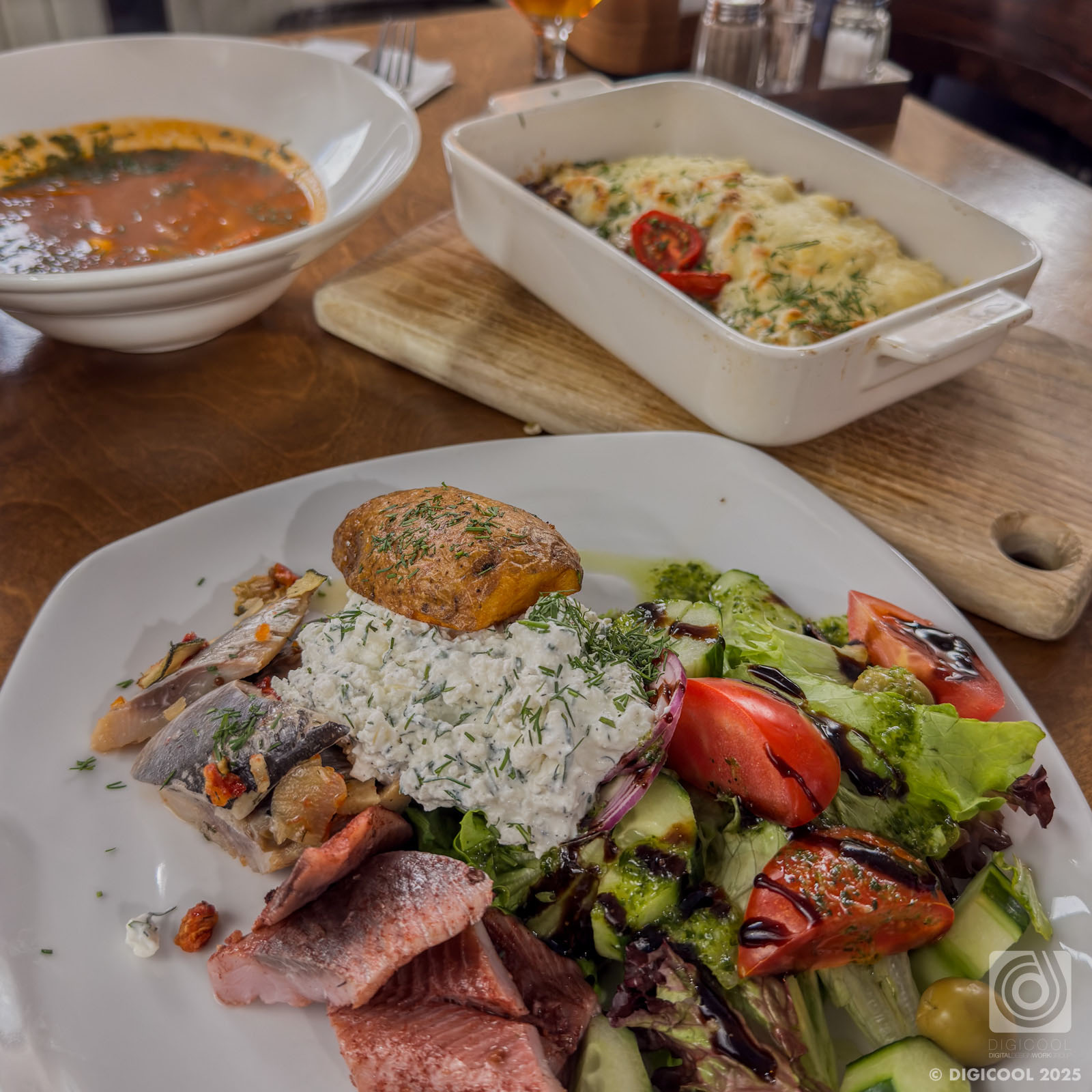 自家製サーモンマリネとシャンピニオンクリームのガレット。
